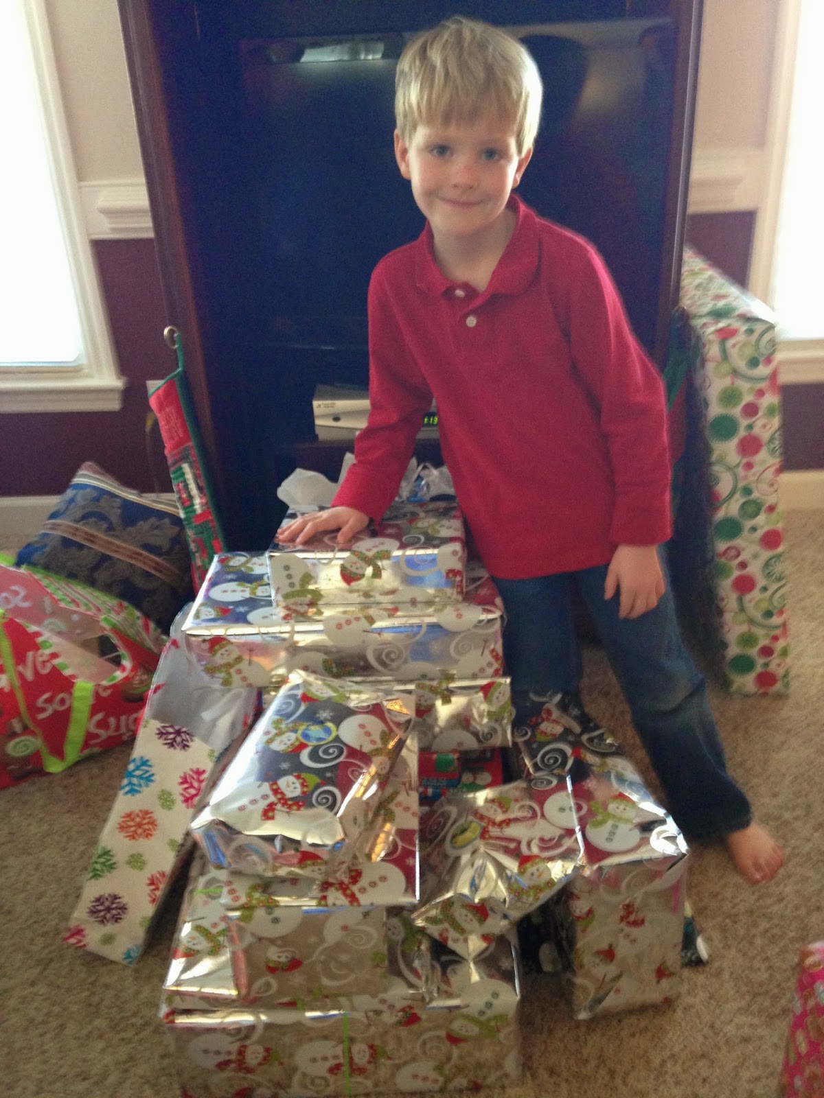 Caleb with his pile of presents - he could read the names this year and helped with making piles for everyone!